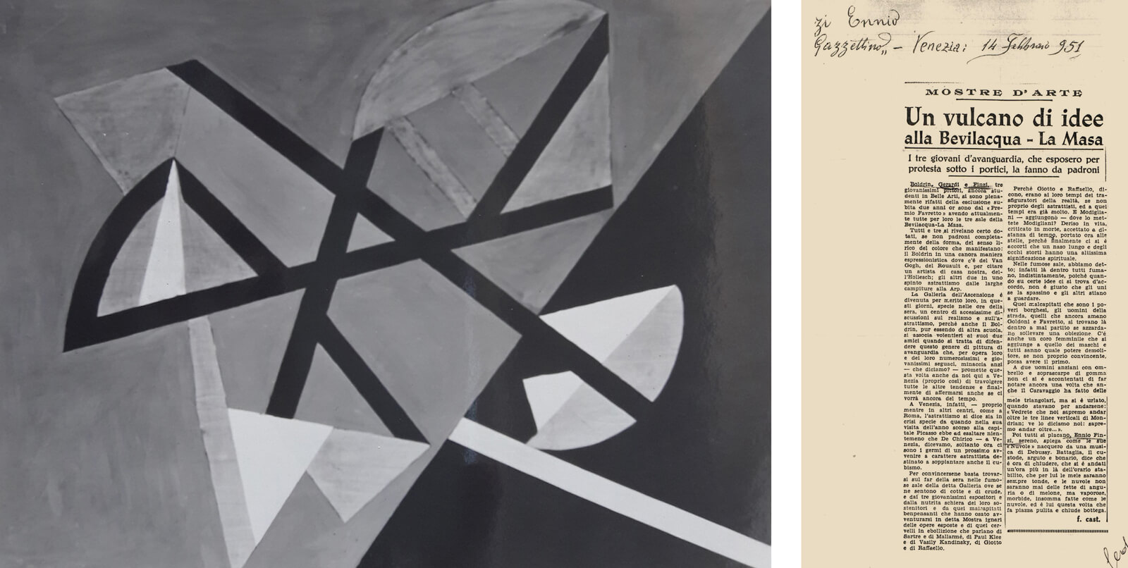 La Galleria dell’Ascensione (in seguito Bevilacqua n.d.r.) è divenuta per merito loro, in questi giorni, specie nelle ore della sera, un centro di accesissime discussioni sul realismo e sull’astrattismo […]. A Venezia, infatti, - proprio mentre in altri centri, come a Roma, l’astrattismo si dice sia in crisi specie da quando nella sua visita dell’anno scorso alla capitale Picasso ebbe a esaltare nientemeno che De Chirico – a Venezia, dicevamo, soltanto ora ci sono i germi di un prossimo avvenire a carattere astrattista destinato a soppiantare anche il cubismo.